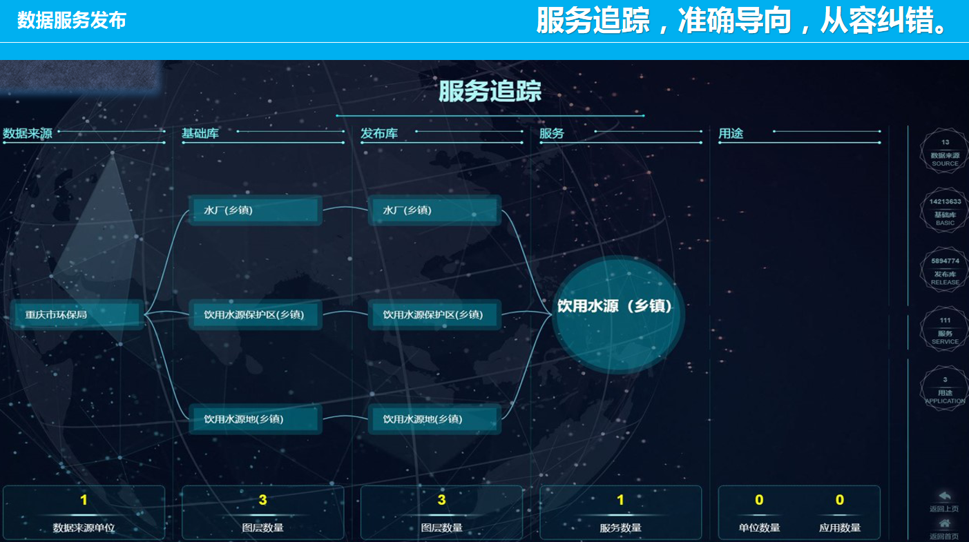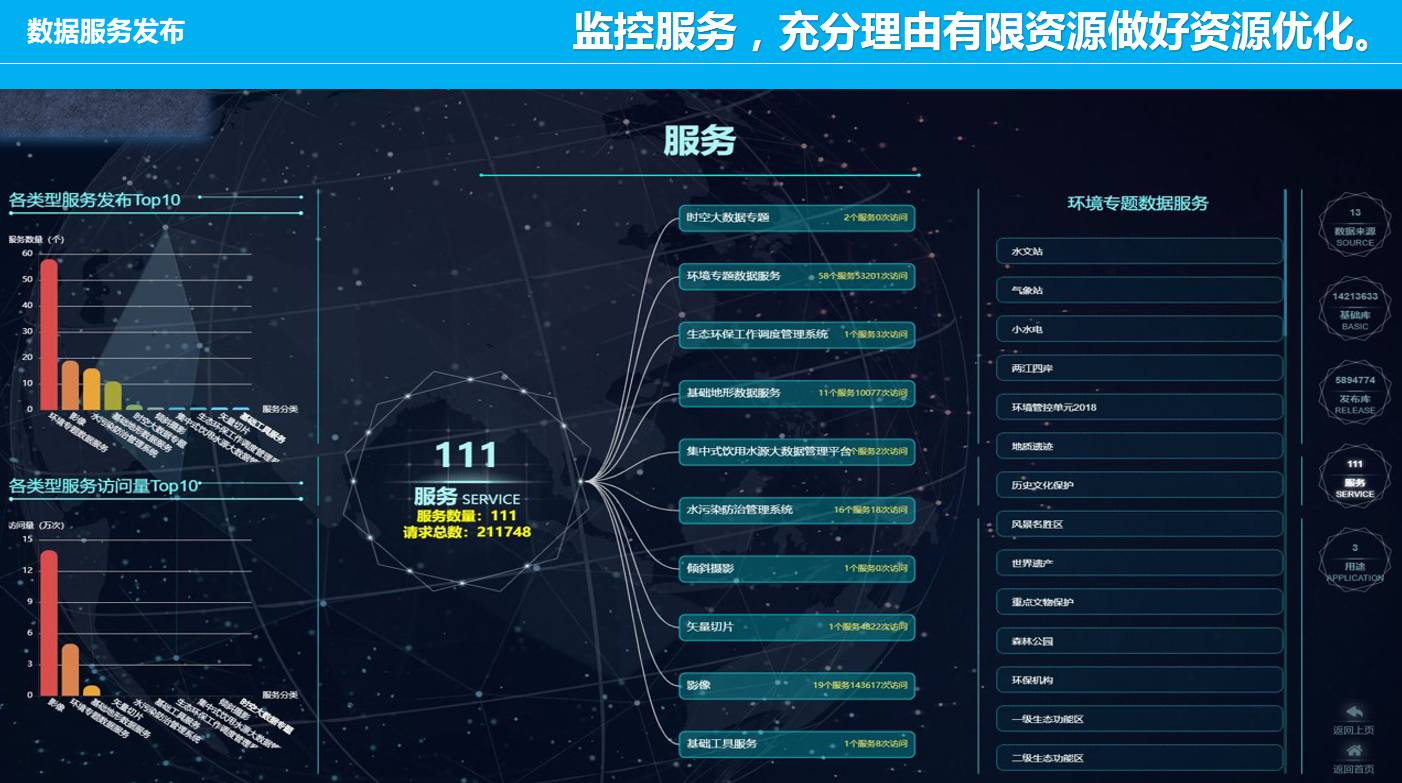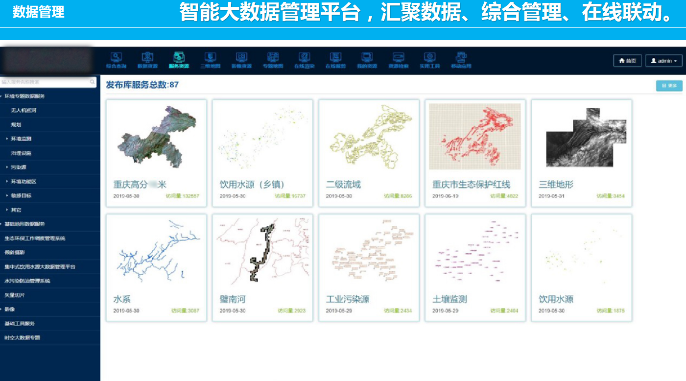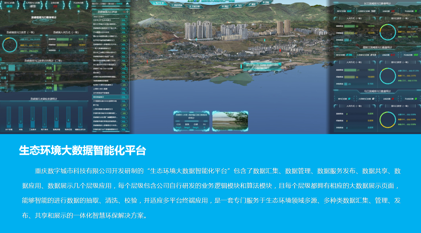 重慶數(shù)字城市科技有限公司開發(fā)研制的“生態(tài)環(huán)境大數(shù)據(jù)智能化平臺”包含了數(shù)據(jù)匯集、數(shù)據(jù)管理、數(shù)據(jù)服務(wù)發(fā)布、數(shù)據(jù)共享、數(shù)據(jù)應(yīng)用、數(shù)據(jù)展示幾個層級應(yīng)用,每個層級包含公司自行研發(fā)的業(yè)務(wù)邏輯模塊和算法模塊,且每個層級都擁有相應(yīng)的大數(shù)據(jù)展示頁面,能夠智能的進行數(shù)據(jù)的抽取、清洗、校驗,并適應(yīng)多平臺終端應(yīng)用,是一套專門服務(wù)于生態(tài)環(huán)境領(lǐng)域多源、多種類數(shù)據(jù)匯集、管理、發(fā)布、共享和展示的一體化智慧環(huán)保解決方案。